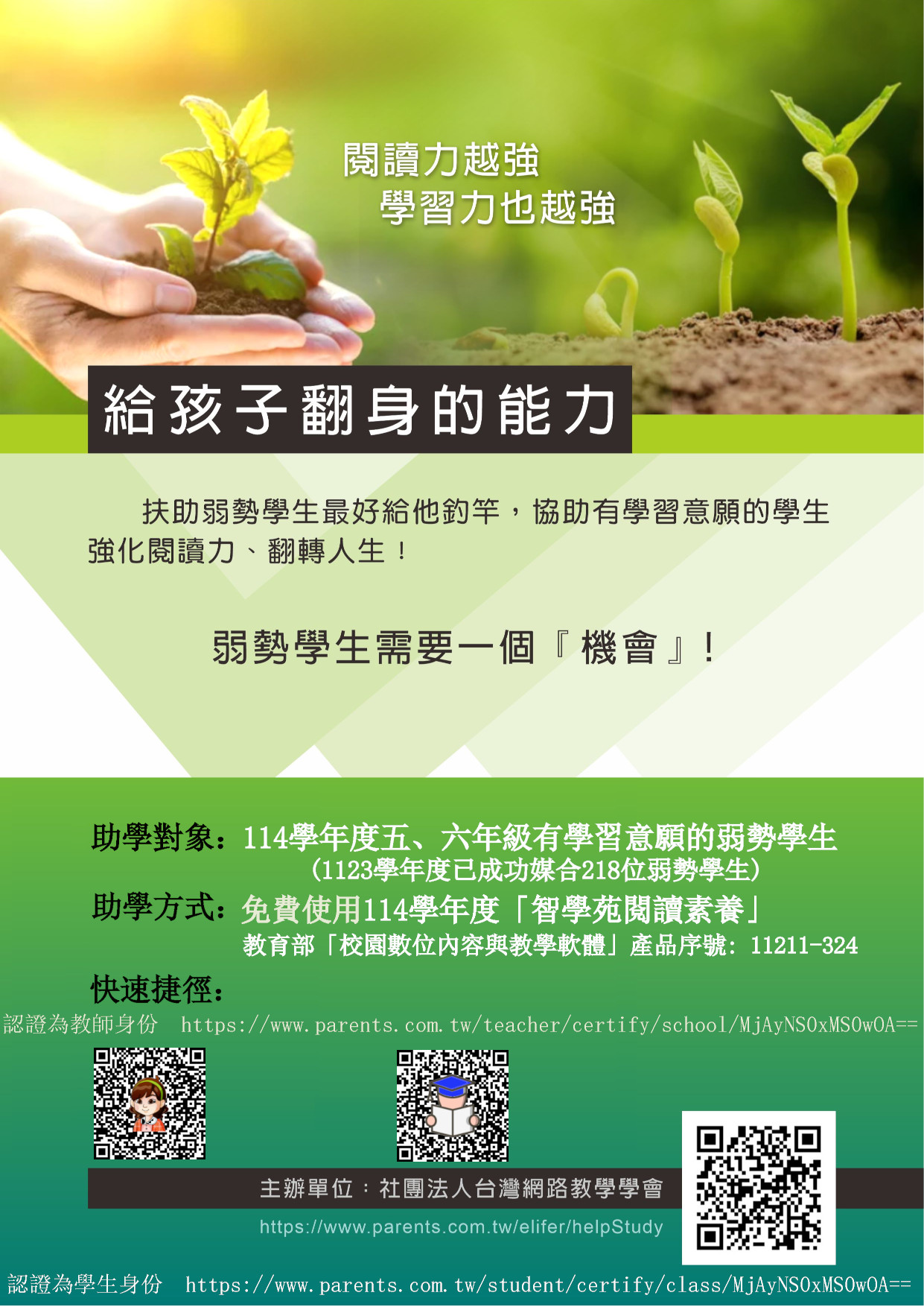 • 敬請貴校協助提報114學年度五、六年級家境清寒且有學習意願的弱勢學生,就能免費使用「114學年度智學苑閱讀素養」,家境清寒的認定由學校教師全權認定,懇請給這些學生一個自我學習、成長的機會。